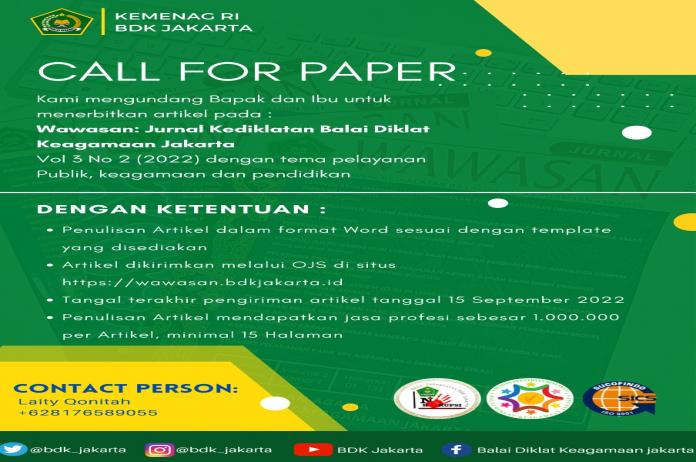 BDK Jakarta mengundang semua pihak yang tertarik dalam penulisan ilmiah untuk berkontribusi dengan menulis di jurnal Wawasan Vol. 3 No. 2/2022. Artikel bertema Pelayanan Publik, Keagamaan dan Pendikan. Silahkan Kunjungi https://wawasan.bdkjakarta.kemenag.go.id