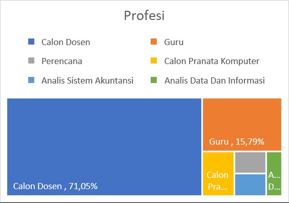 Profesi yang terbanyak ditempati oleh alumnus Latsar CPNS 2021 Kota Pontianak ini 71,05% Calon Dosen yang terdiri dari Calon Dosen 93% dari IAIN Pontianak dan 7% dari STAKatN Pontianak. Kemudian diikuti oleh Guru sebanyak 15,79%, Calon Pranata Komputer 5,26% kemudian masing-masing 2,63% Perencana, Analisis Sistem Akuntansi Instansi dan Analis Data dan Informasi Pendidikan.