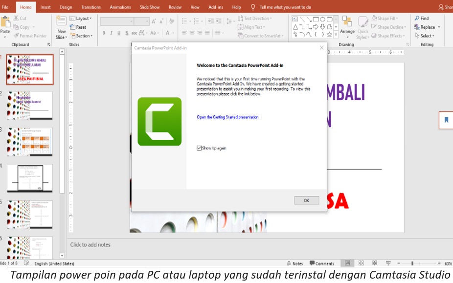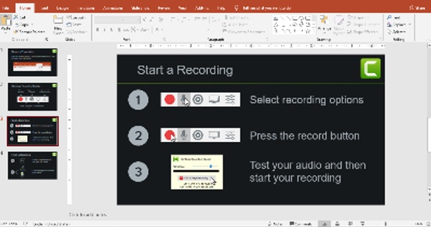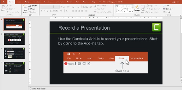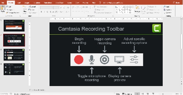 Ada tiga keuntungan menggunakan Camtasia Studio dalam pembelajaran jarak jauh. Pertama, membuat video pembelajaran dengan Camtasia Studio cukup mudah karena komputer atau laptop yang sudah terpasang Camtasia studio secara otomatis power poinnya sudah menyatu dengannya. Seperti pada gambar berikut