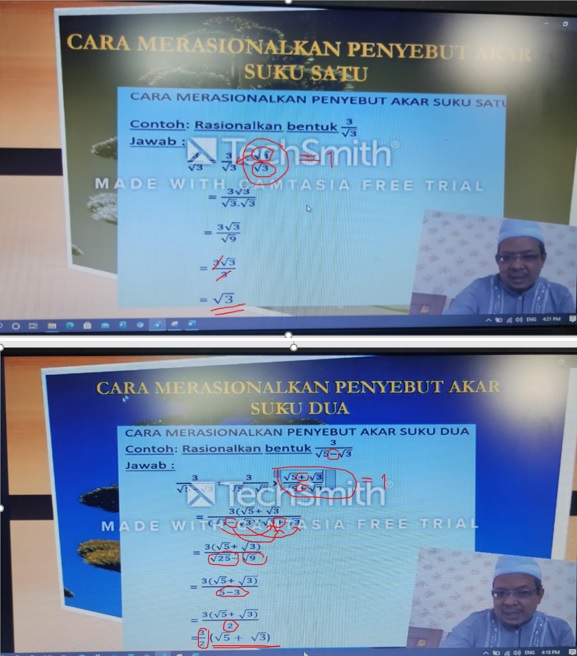 Kedua, video pembelajaran dengan Camtasia Sudio dapat menghadirkan guru di hadapan para siswanya dimana saja mereka belajar. Para siswa juga dapat memperhatikan guru menjelaskan seperti saat guru menjelaskan di papan tulis sambil memberikan tanda pada bagian-bagian kata atau symbol yang penting untuk menjadi perhatian siswa misal dengan garis bawah, lingkaran, bentuk segi empat. Hal ini bisa dilakukan dengan menggunakan fasilitas pen, laser pointer dan highlighter yang ada di power poin. Dengan cara ini siswa akan termotivasi dan berminat mengikuti pembelajaran matematika. Seperti pada gambar berikut.